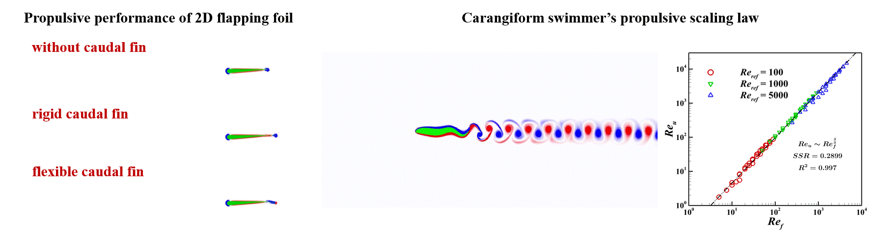 Utilizing the developed FSI method, we investigate the effects of caudal fin's flexibility on the self-propulsive performance and the propulsive scaling laws of Carangiform swimmers.